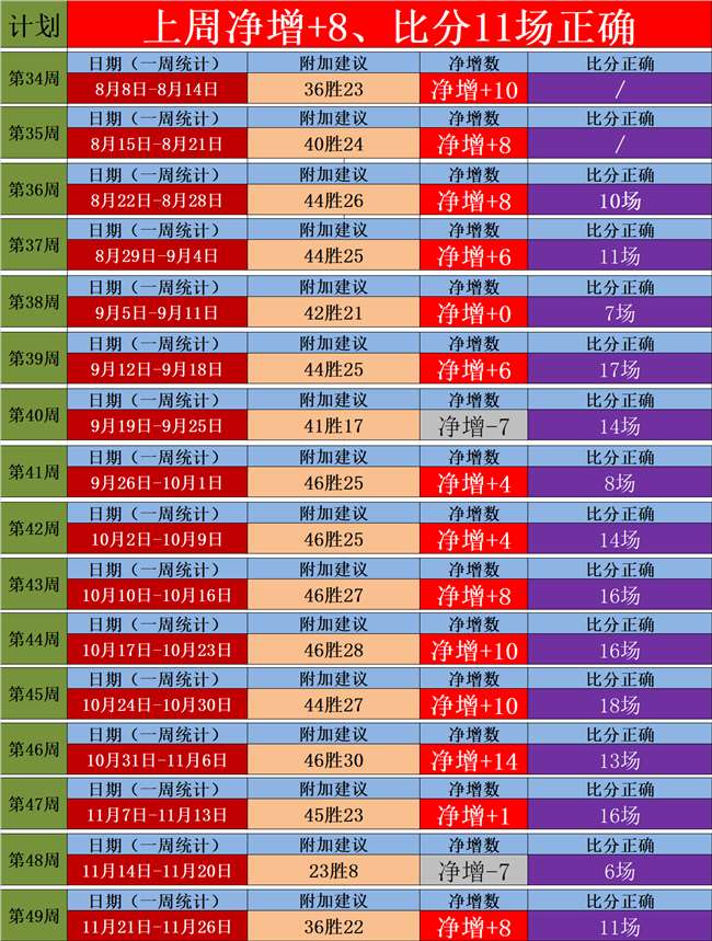 二、上周持续放弃增进,净增+8,上周预测161场比分正确,继续的放弃了高效的稳固。
